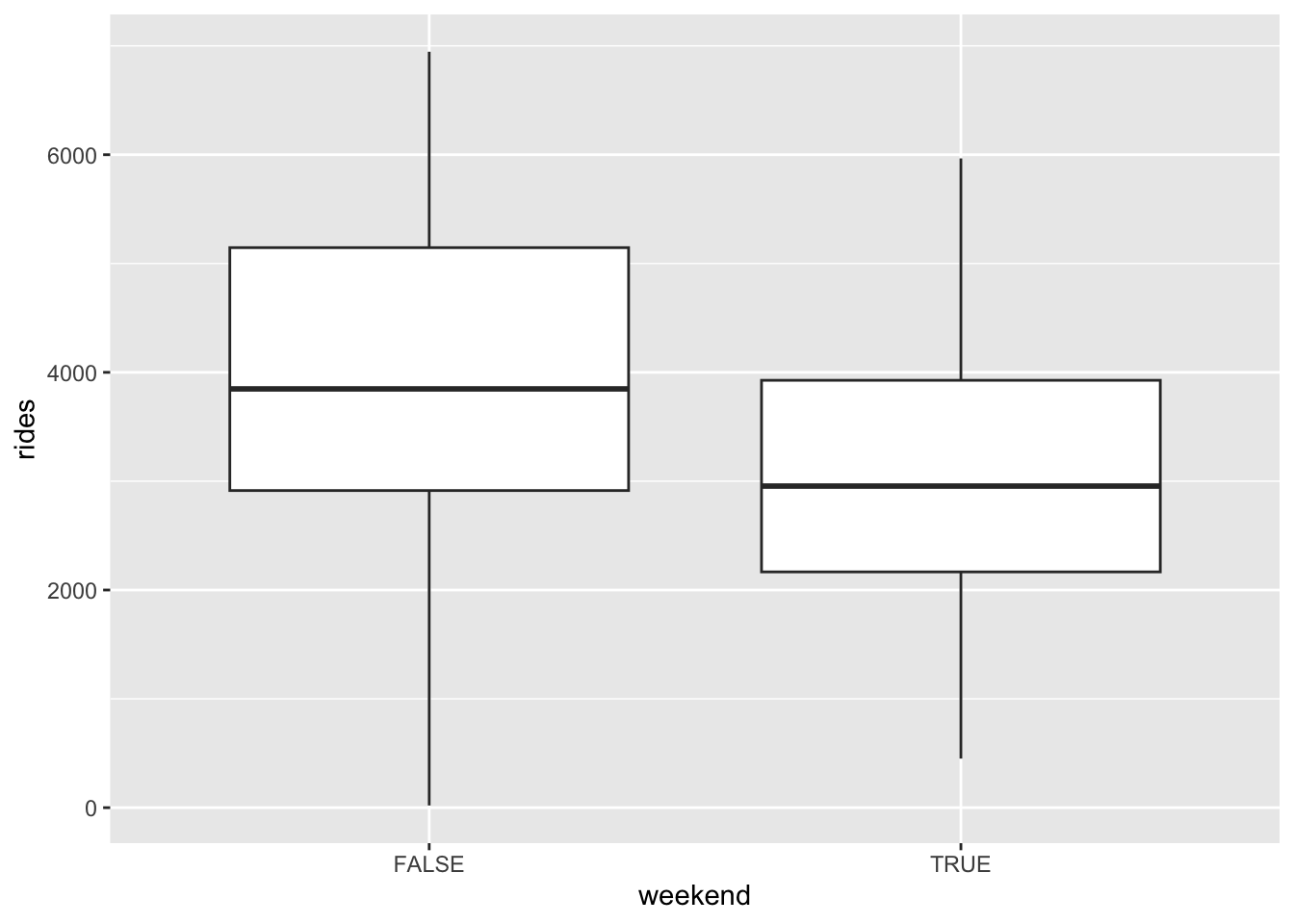 ggplot(bikes, aes(y = rides, x = weekend)) +