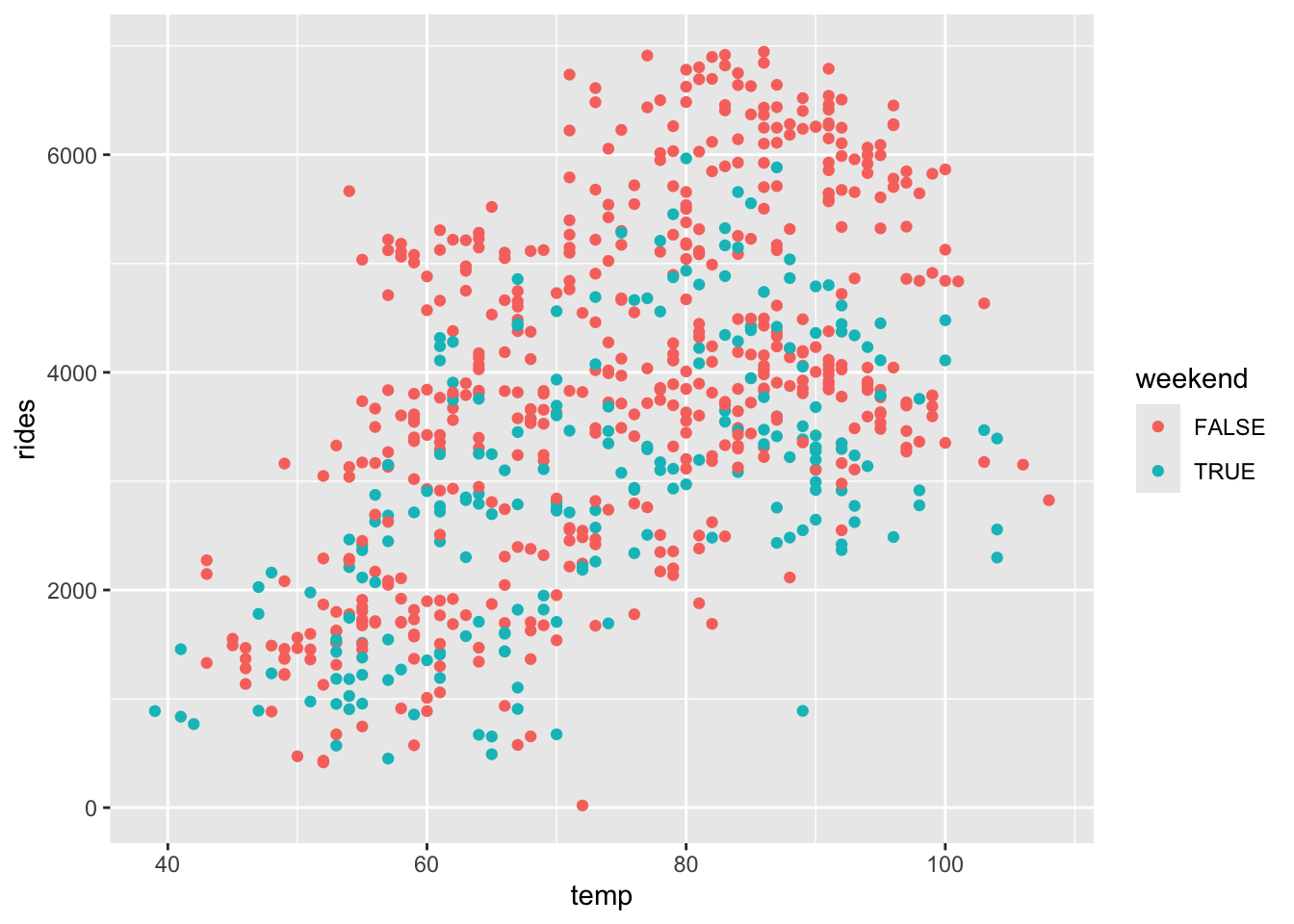 ggplot(bikes, aes(y = rides, x = temp, color = weekend)) +