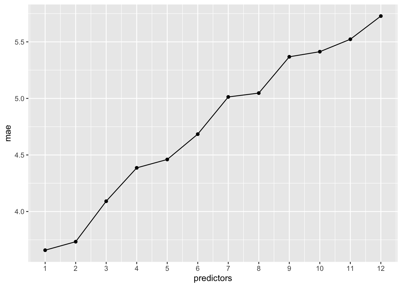 If I were looking at the other MAE plot, though, I might pick a model with 1 (the simplest), 2 (still simple, but better MAE than 1 predictor), or 5 predictors (the model with the best CV MAE).