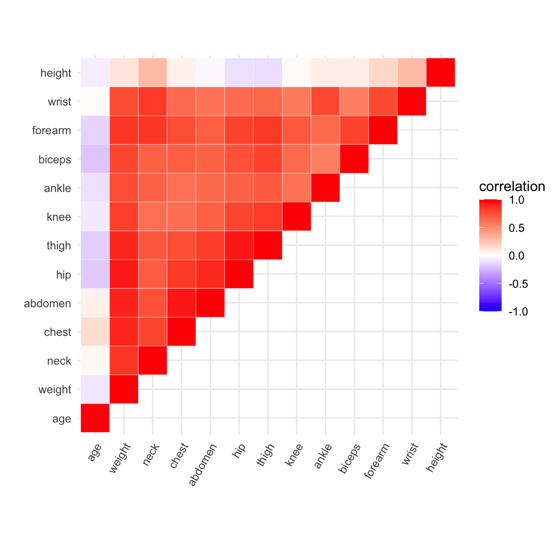 # Get the correlation matrixlibrary(reshape2)cor_matrix <-cor(humans)cor_matrix[lower.tri(cor_matrix)] <-NAcor_matrix <- cor_matrix %>%melt() %>%na.omit() %>%rename(correlation = value)# Visualize the correlation for each pair of variablesggplot(cor_matrix, aes(x = Var1, y = Var2, fill = correlation)) +geom_tile(color ="white") +scale_fill_gradient2(low ="blue", high ="red", mid ="white", midpoint =0, limit =c(-1,1)) +labs(x ="", y ="") +theme_minimal() +theme(axis.text.x =element_text(angle =60, hjust =1)) +coord_fixed()