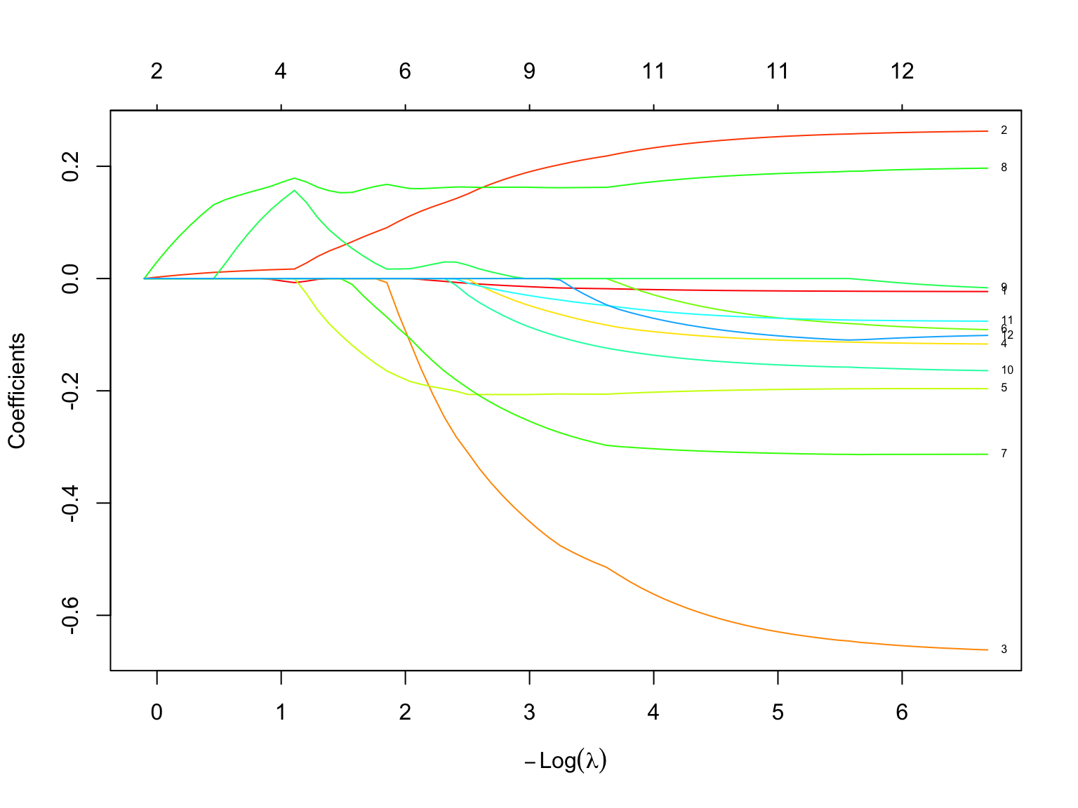 - coefficients are shrinking toward or to 0 as \(\lambda\) increases (ie \(-\log(\lambda)\) decreases)