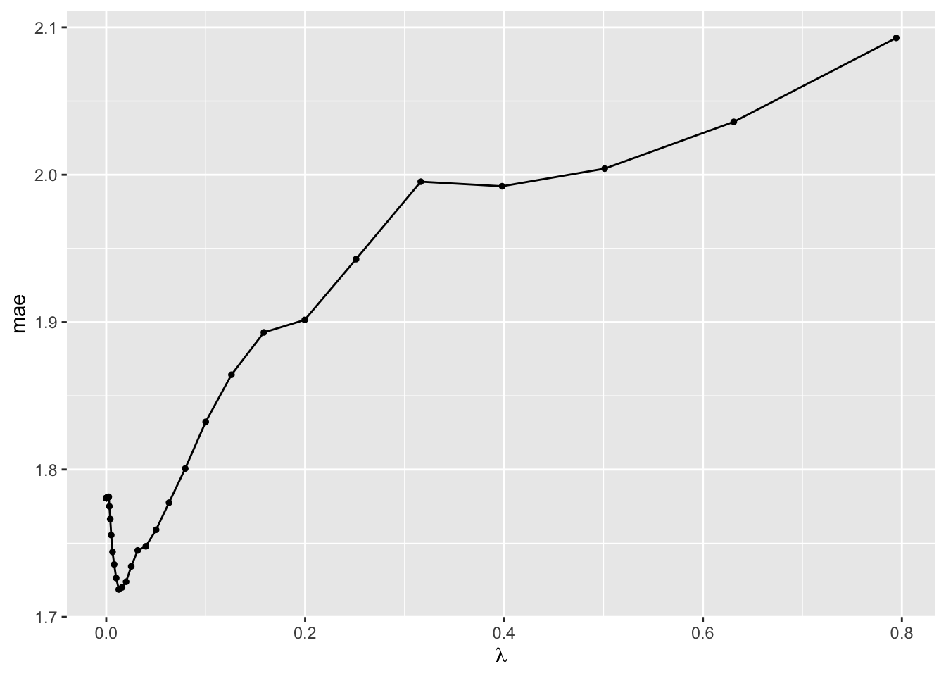 To confirm that the MAE of our final LASSO model is 1.9, as the exercise claims, there are two approaches. One involves pulling this result out of work we did earlier: recall that in tuning our \(\lambda\) value, we ran 100 LASSO models using 100 different choices of \(\lambda\), evaluating the MAE of each using 10-fold CV. We plotted all of these MAEs in Exercise 1. Looking at that plot, we just need to find our final choice of \(\lambda\) (approx 0.2), and then check what MAE it resulted in (approx 1.9). But we can be more precise than that. Let’s pull the actual MAE out of the lasso_models results: