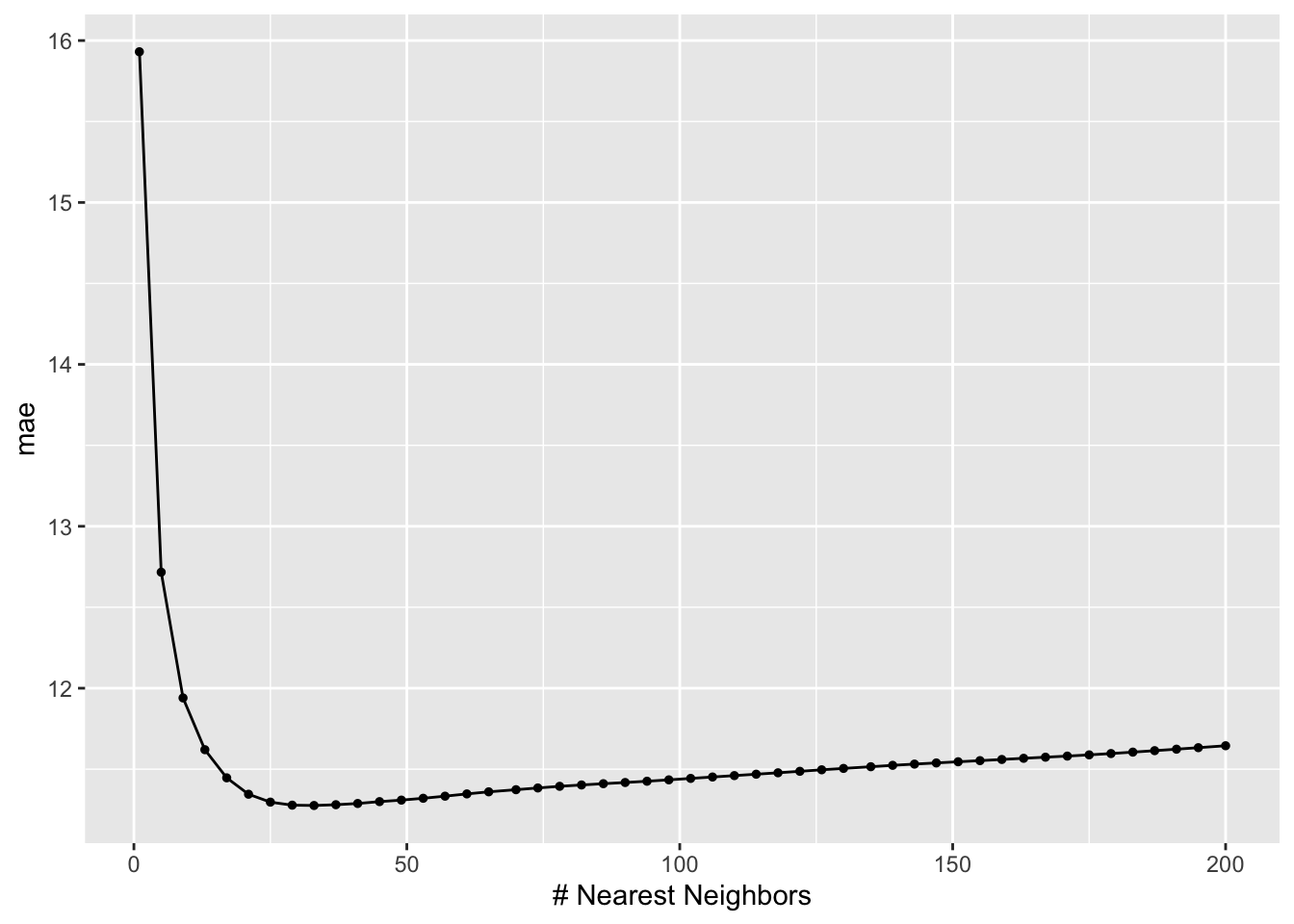 Use knn_models %>% collect_metrics() %>% filter(neighbors == ___) to compare the CV MAE for the best \(k\) to the \(k\) for the simpler model.