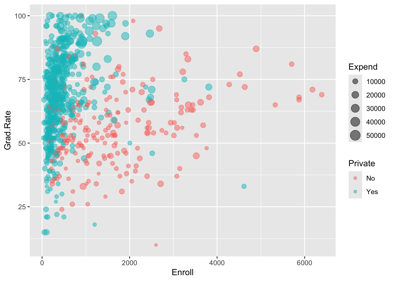 ggplot(college_sub, aes(y = Grad.Rate, x = Enroll, size = Expend, color = Private)) +